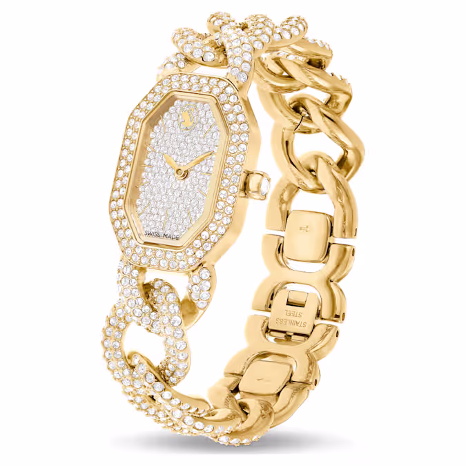 Etheria’nın efsanevi sekizgen şeklini vurgulayan ve 815 adet kristalle yerleştirilen bu göz kamaştırıcı saat, tıpkı lüks bir takıymışçasına görkemli bir tarz sunar. Uzunluğu 44 mm olan seçkin kasa, yüzeyinde altın rengiyle çerçeve kısmında ise ışıltılı pavé ile tamamlanıyor. Kadranı ise 192 adet yuvarlak kesimli kristaliyle ve saat 12 yönündeki zarif kuğu logosuyla gün boyu ışıltı saçar. Saat, 530 adet kristalle süslenen ayarlanabilir gurme bir zincirle bileğinizi sararken tekli kristal ise kurma koluna yerleştirilmiştir. Bu İsviçre yapımı saat 30 m’ye kadar suya dayanıklıdır ve size hem günlük ihtişamınız hem de görkemli özel günler için eşsiz bir seçenek sunar.