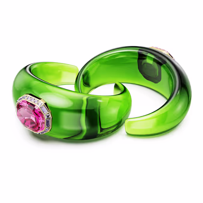 Enerji verici yeşil tonlarıyla bu Dulcis kelepçe bileklikler, oyuncu günler için tasarlandı. Şekerden ilham alan set, biri orta kısımda yer alan sekizgen kesim pembe kristal, diğeri ise yeşil renk kristal olmak üzere iki adet açık yeşil bantla tamamlanıyor. Her bir kristal, altın rengi kaplama bir çerçeve içinde ışıltılı pavé ile çevreleniyor. Tek başına kullanıldığında göz alıcı, aynı ailedeki uyumlu takılarla birlikte kullanıldığında ise renkli bir dikkat çekici parçaya hayat verir.