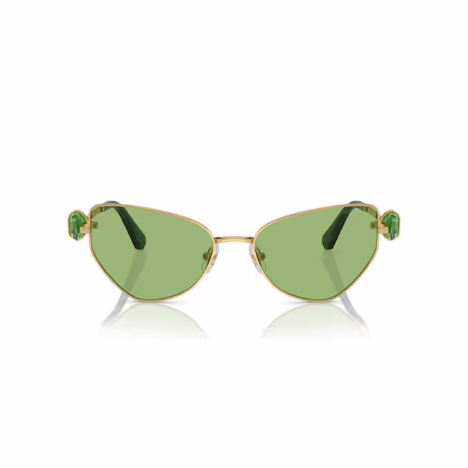 Kedi gözü tasarımıyla diğer gözlüklerin arasından sıyrılan bu model, ihtişamlı görünümler için hazırlandı. Altın rengi metalik çerçeveler, koyu yeşil camlarla kontrast oluşturacak şekilde bir araya getirildi ve her iki sapta da mafsallı sekizgen kesim kristaller yer alıyor. Bu tasarım cesur Lucent ailesinden ilham alıyor ve güneşle buluştuğunuz her seferde görünümünüze şık bir kıvılcım katması için tasarlandı.